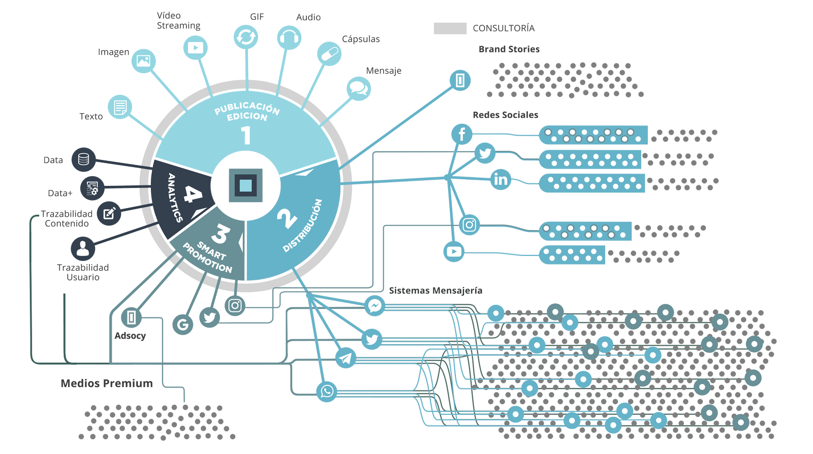 Una solución 360º con acceso SAAS que trabaja desde la distribución de contenido hasta el conocimiento de tus clientes: dónde están, qué quieren, cuándo lo quieren y cómo.